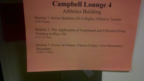 During the third presentation, Cathleen Dnyprowsky and Alyson Lamonte of Oceanside School District discussed ‘Accountability & Assessments in Phys Ed‘, which gave the audience a look at policies and procedures the two were using at Oceanside High School. While the topic wasn’t very glamorous, it was certainly important and educational, especially for a student to see. Hearing about the ‘business’ side of teaching was important, and the pair explained how they grade skills, knowledge, and personal/social responsibility. Their hand out consisted of a number of rubrics used, and I’ll be using them to develop some of my own assessment tools. The rubrics assessed student participation, performance, and personal review of each and every lesson, and provided the framework for the grading policy. Daily results could be plugged into software that calculated grades on multiple factors, and can easily provide feedback on student success to the teachers. As the session came to a close, an athletic director in attendance pointed out just how important accountability was for physical education, as the field is being hit hard by budget cuts. This session was definitely under-attended, and provided a great deal of ‘real world’ information to those in attendance.