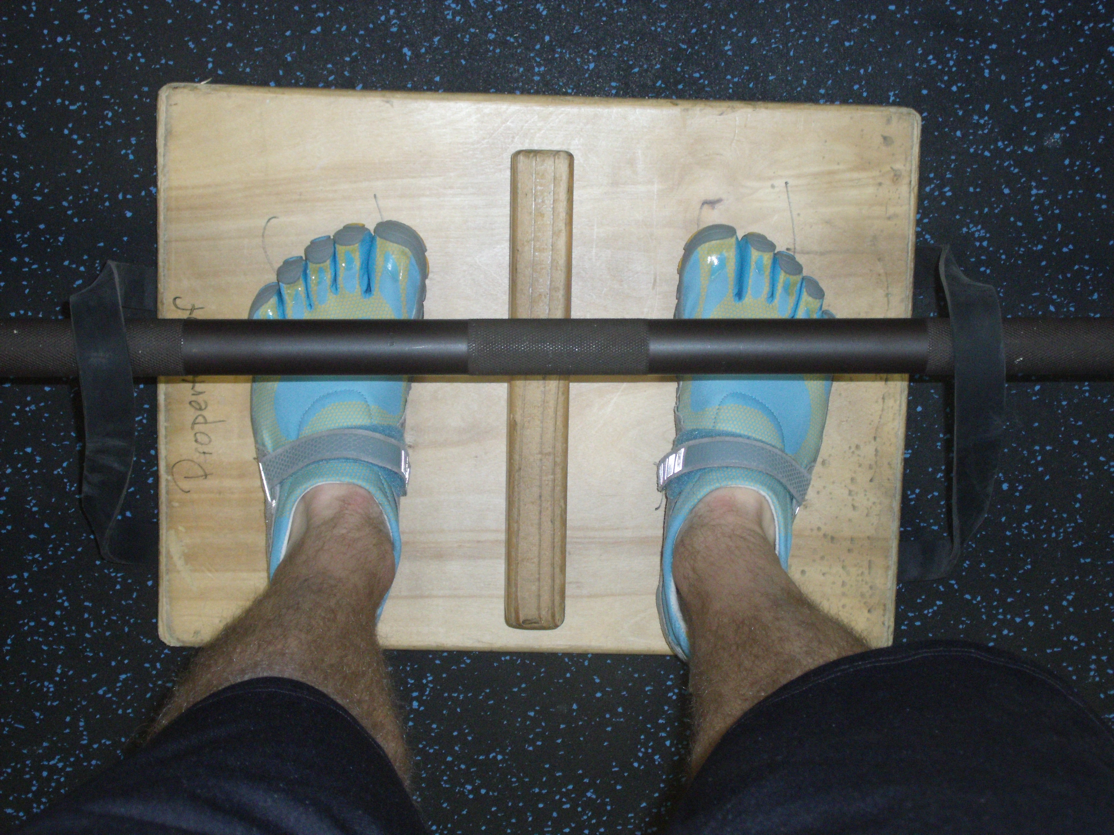The easiest bands to use are flat ones; round tubing has the tendency to role and slide. I’ve used two different Superbands from Perform Better, and will be picking up some short bands from EliteFTS shortly, to see what a heavier band feels like. There are a number of ways to secure the band around the bar. You could simply wrap the band around your barbell, then stand on it; however, this will probably be pretty uncomfortable for your feet. I’ve tried using a 45lb plate to hold the band down, but they’re not large enough to a proper stance. The solution I’ve liked the best is to use a balance board that is at my gym. Flipping the board upside provides a sturdy surface to deadlift off of, and the ‘deficit’ created by the board is no more than an inch. I simply drape the band oer the barbell, slide the board in, and make sure everything is symmetrical. Below is a picture, where you can not only see the band/board/barbell set up, but also my obnoxiously bright Vibram Bikilas.