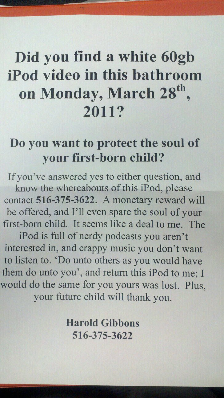Outside of the endless amounts of work I have to do, I’m certainly keeping busy with things. Last Monday, I accidentally left my iPod in a bathroom stall after training at Adelphi. It only took me a few minutes to realize this and I called a friend, but it was too late: A kind soul decided that the economic reward of keeping my iPod was greater than the ethical reward of returning it to it’s rightful owner. In all honesty, had I found the forgotten electronics of a stranger, I’d turn it in to the closest lost-and-found, and hope they found what they were missing. Maybe I’m a sucker, but I believe the Golden Rule is the most important law we have; I even included it in the notice that I hung up around the building. I had some great feedback, but unfortunately never got my iPod back. Unfortunately, someone’s child will pay for their father’s mistake.