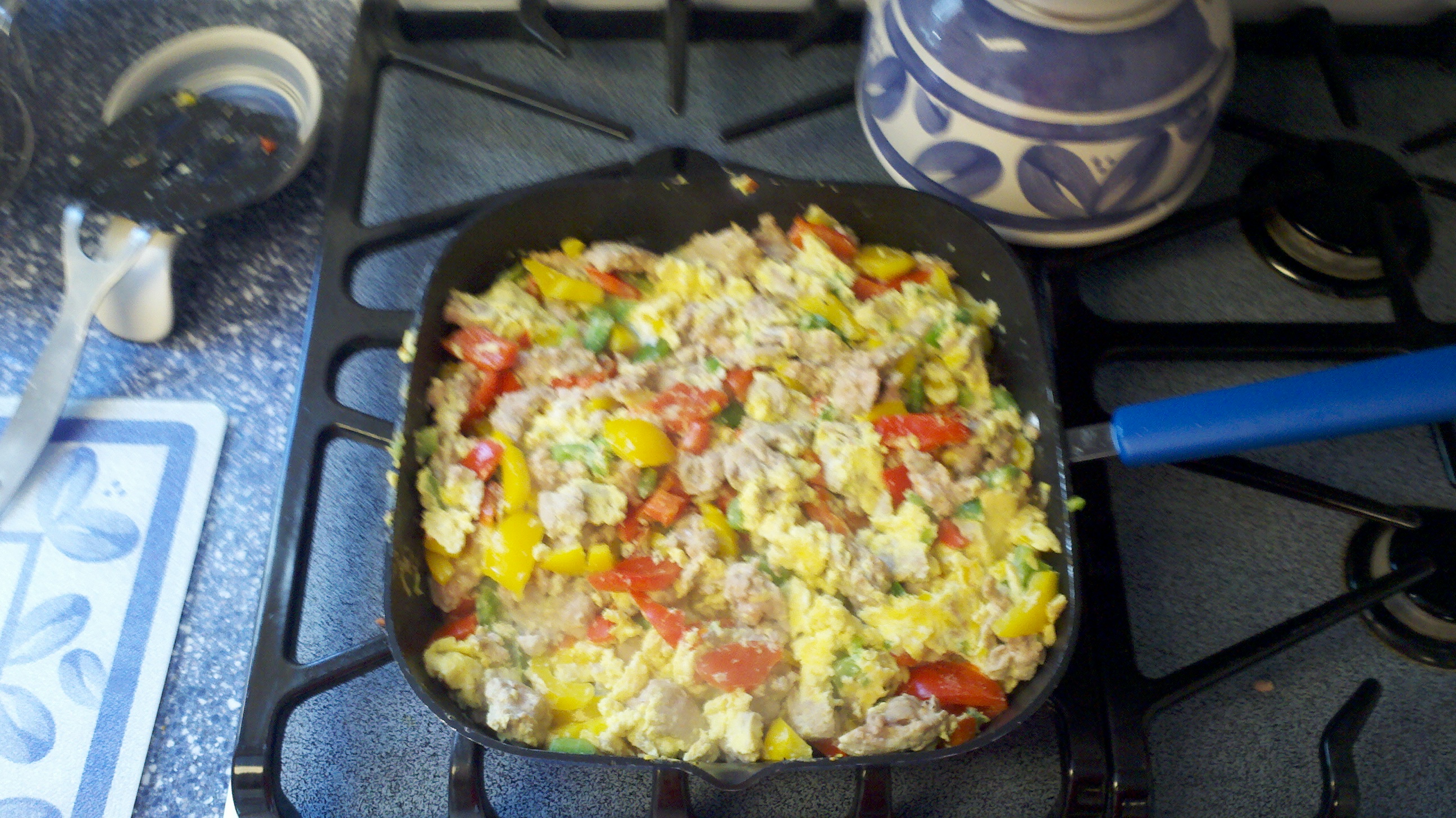 Step One: Cook ground turkey. I coated the pan, the broke the turkey into smaller bits and cracked some pepper on to it.. I left the heat on medium low, so I would have plenty of time to complete Step Two, which involved me cutting up the peppers. I’ve never had to do this before, so it took a little longer than it should have, but I figured it all out. After I cut the peppers, I stirred the turkey/pepper mix around so the flavors could mix. After letting the mix cook for 5 minutes, I added 6 beaten eggs. Again, I stirred the mixture around, then let it cook for 8 minutes, stirring every minute. After this time, I turned off the burner, pulled at plates, and served some for my mom and myself. If she bought the ingredients, I should let her try it out, right? Thanks, Mom.
