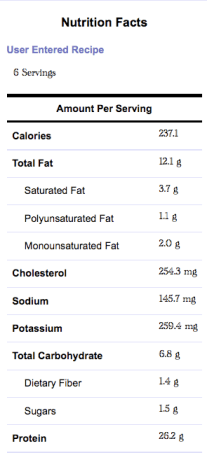 As you can see, this is a pretty hassle free recipe. The most time consuming part was cutting up the peppers, and that will get even faster next time. The recipe makes a ton of food, and I’ll use the 6 eggs to consider it 6 servings. Considering the ingredient list, I found a recipe calculator on Google, and counted up all of the information. Below you’ll see the nutrition information for one serving: