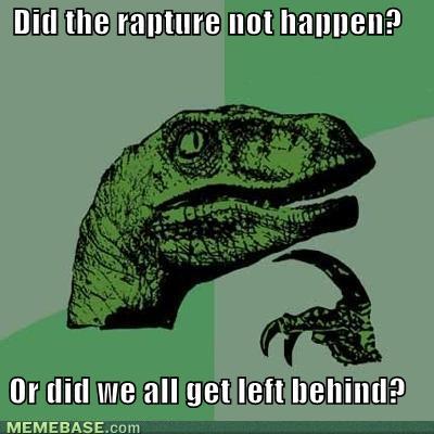 When I was in 6th grade, the world was supposed to end.Β Across the world, people were searching for prophets and profits to understand how to avoid the impending doom.Β At age twelve, I wasn’t exactly mature enough to understand the implications of the world ending, but I remember laughing with my family when we realized it was just like every other night.Β The same thing happened on Saturday, but I suppose we don’t really know what’s going to happen until October 21st, 6 months from now.Β I’m just a little upset that the fanatic who predicted the Rapture is also named Harold.Β We’re supposed to be a classy bunch!
