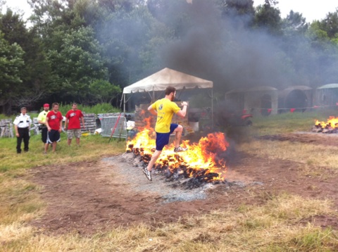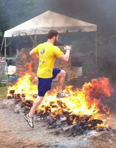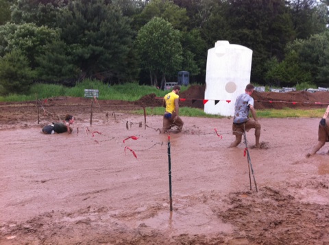 Towards the end of the event, obstacles were packed in tight, which was a thrill for both competitors and spectators alike. After leaving the woods, the first obstacle was a giant cargo net, which required more balance than strength. 10-20 people were on it at any given time, and the net shifted every time someone came on, got off, or crossed over at the top. After the cargo net, a car graveyard was sandwiched between grids that were 50 tires deep. After high kneeing through the tires, we went up and over 2 rows of destroyed cars, and back through another set of tires. From here, it was hurdling over two rows of fire during the “Warrior Roast”, then off to the mud pit to crawl beneath barbed wire before crossing the finish line. Along this finishing stretch, spectators and muddy finishers gathered to cheer on racers, and after Tim and I got cleaned up we stopped by to cheer on a friend running in a later heat. We got to say high to Mike after he finished, and then it was time to go.