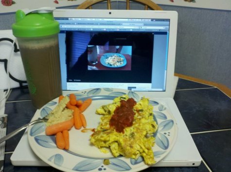 This second picture comes from my ‘reply’ breakfast to Eric. I even took my picture with his in the background, so he’d know it was from the same day! On my plate, I have 6 eggs scrambled with diced green peppers and a chili powder. They are covered with some garden sweet salsa, and you can see hummus and carrots next to the plate. In the past week or so I’ve experimented with the chili powder a few times, and it’s really tasty. I haven’t been measuring it exactly, but I think that a sprinkle or shake per egg is relatively accurate. The extra kick, plus the flavor and texture of the peppers, and salsa, makes for a great morning wake up.