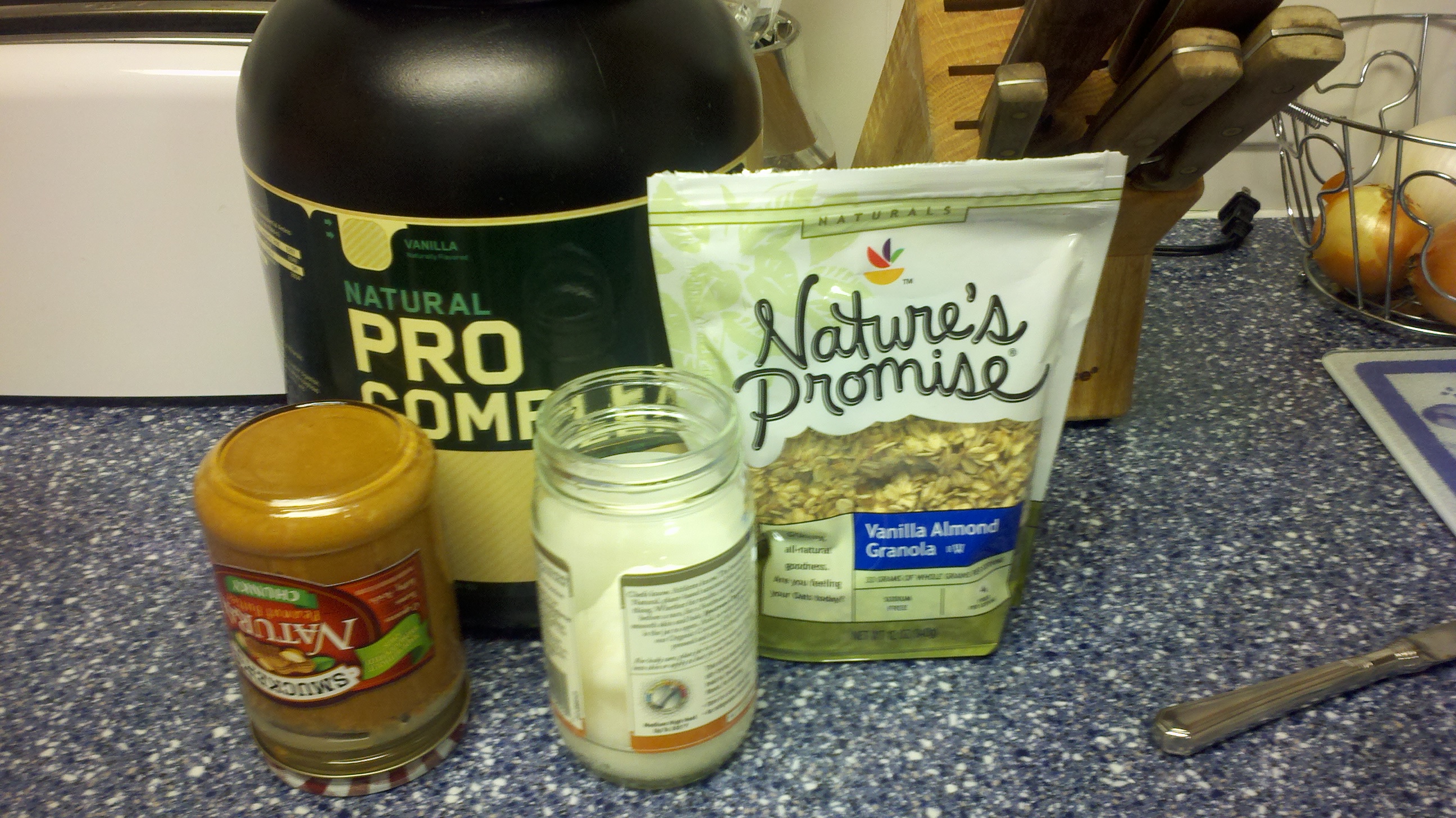 I combined about 1 cup of peanut butter with 2 tablespoons of butter, and microwaved it in Pyrex bowl, stirring ever minute. After three minutes, it was well-blended and had a nice gooey/creamy consistency. Perfect. I added 1 scoop of vanilla whey protein and stirred for about 5 minutes until it had all blended it. (Note to self: Add in smaller amounts next time.)
