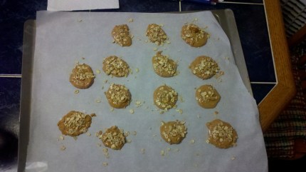 After this three ingredient blend was mixed, I scooped out spoonfuls onto parchment paper, let them settle and flatten out, then sprinkled some Nature’s Promise Vanilla Almond granola on top. After patting the cookies down so the granola would stick, I placed the cookie sheet out on my front porch. The temperature has hovered below freezing all weekend, so I basically had a glass-enclosed freezer to use.