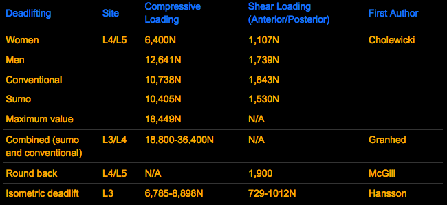 Below, you’ll see research cited in The Contreras Files: Volume II which compares spinal forces during deadlifting. The column of interest here is the one which details Sheer Loading (Anterior/Posterior) data. When comparing numbers, you’ll see that the sumo deadlift has lower measures of sheer force than the conventional deadlift (1,530N vs. 1,643N), which are significantly lower than the sheer forces associated with the rounded back deadlift (1,900N).