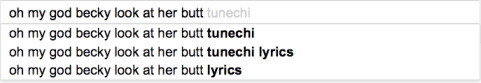 At a recent family function, I was having a conversation with my 12 year old cousin, my brother, and his girlfriend. At some point in the conversation, my logic train took me to “Oh my god, Becky, look at her butt.” I was surprised that the first response was “Tunechi!”, from the 12 year old. Excuse me? Apparently, that’s the line from the worst song ever, The Motto, which I’ve ranted about before. Apparently, crappy music has caught up to the Google search engine: