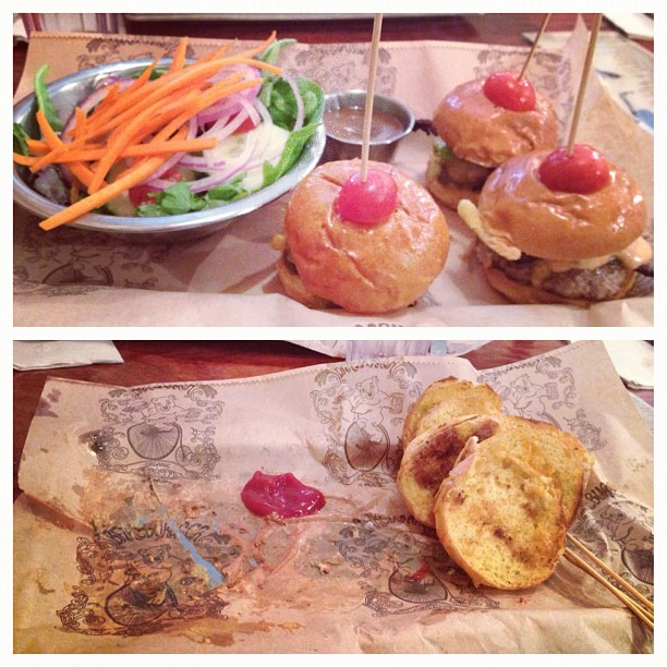 We each got the same thing: A house salad and three sliders (medium) with maple bacon and avocado. The only difference was the meat: Juliet got Ostrich, Erika got Elk, and I got Wild Boar. Once our foot arrived, we each swapped two burgers, so we had one of each. It literally split the entire meal.