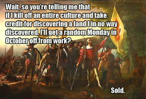 There are quite a few people in America today who are very pleased to celebrate Columbus Day by sleeping in, and enjoying their three day weekend. If that is you, I hope you enjoy the day. If that is not you, don’t worry; Columbus isn’t the kind of guy you want to celebrate.