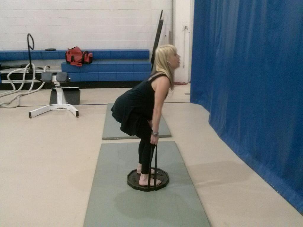 The plate set-up came about while I was deadlifting in socks, and heavier bands made me feel like I was about to roll an ankle. The plate helps minimize the band yankin’ on your sock or pulling on your foot. Here’s a picture of Amy using the plate set-up:
