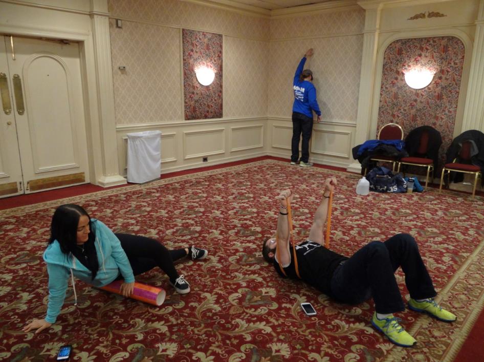 Right before the first flight of deadlifts began we were joined by Erika Hurst of HurstStrength.com. Erika is a bundle of fun, sarcasm, and judgement, which is why she and I get along so well. Erika helped call numbers for deadlifts, and we had a good time getting nerdy about exercise technique and strategies. She’s also a bigger mobility nerd than I am, and Juliet snapped this impromptu picture of the three of us going to town on tissue quality: