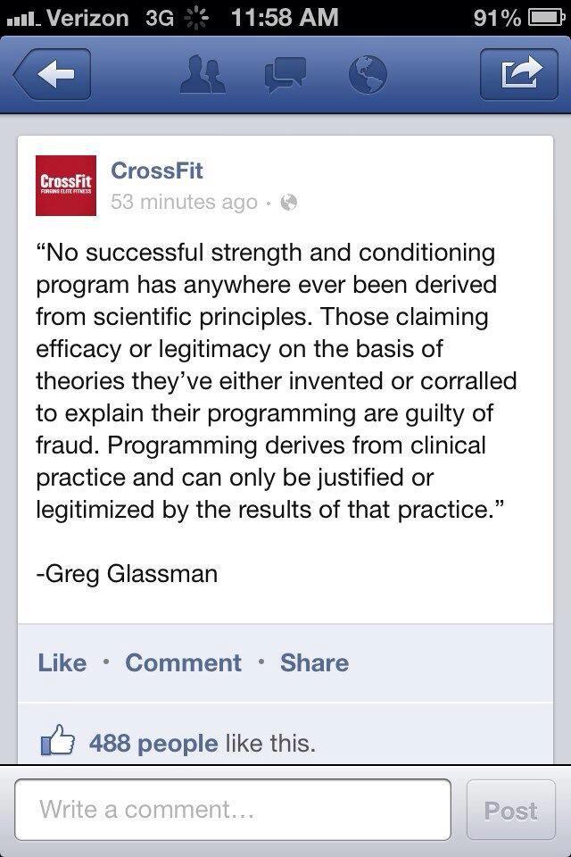 Except it isn’t all a guess. On PubMed, there are 250,655 hits for “Exercise“, 16,812 hits for “Strength Training“, and 9,568 hits for “Resistance Training.” There are 3 hits for CrossFit, and only one of them discusses the activity. There are certainly guesses in the fitness world, from the most open ended physical activity programs to the most detailed strength and conditioning programs. However, those ‘guesses’ are far more limited than one would presume from the statement above. Further, these ‘guesses’ are typically contained to single variables that allow coaches to determine slight changes in programming, and not make broad assumptions or implementing complete overhauls. To assume that all strength and conditioning is a complete fraud makes an ass out of you and me, Mr. Glassman.