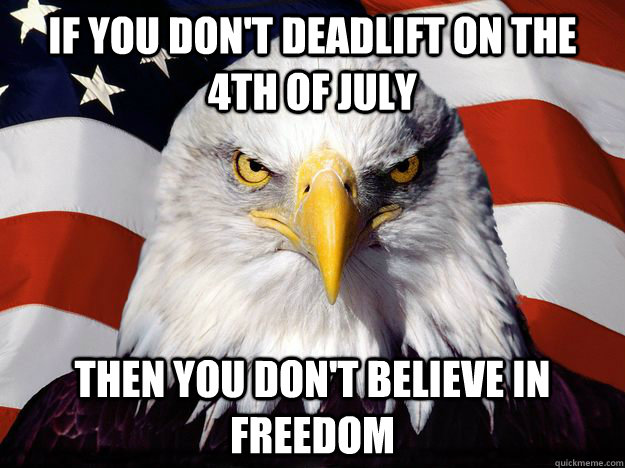 Your 6-second history lesson is that the Fourth of July is a federal holiday in the United States commemorating the adoption of the Declaration of Independence on July 4, 1776, declaring independence from the Kingdom of Great Britain. Sorry, your majesty, but you weren’t down to party. To commemorate this fine event, we celebrate with fireworks, parades, barbecues, carnivals, fairs, picnics, concerts, baseball games, family reunions, and political speeches and ceremonies in addition to various other public and private events celebrating the history, government, and traditions of the United States.Alright, I’m not going to lie, most of that definition is from Wikipedia. Unfortunately the part that they left out is that In ‘Murica we also celebrate freedom with the deadlift!