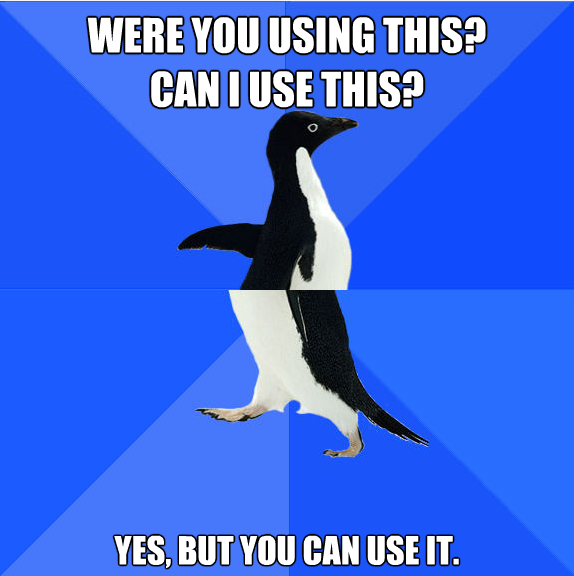 Perhaps I’m cynical, or I haven’t seen your own open interactions. Calling upon my own experience, I find that we’re become hyper-territorial at the gym. Once one has laid claim to a piece of equipment, they defend it against all challengers, less they lose command of their resource. It’s the social Monopoly of the gym culture. What the hell is it all about?