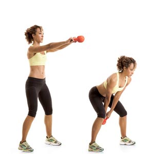 The three exercises discussed are ones that benefit from heavier-than-normal external loads. For the swing, a heavier weight prevents you from compensating with the shoulders and arms. A weight that you’re able to front raise isn’t going to cut it. If it’s too heavy to raise, you’re hips will be more active, and that’s the goal. Using your hips, not your arms. Here’s an example: