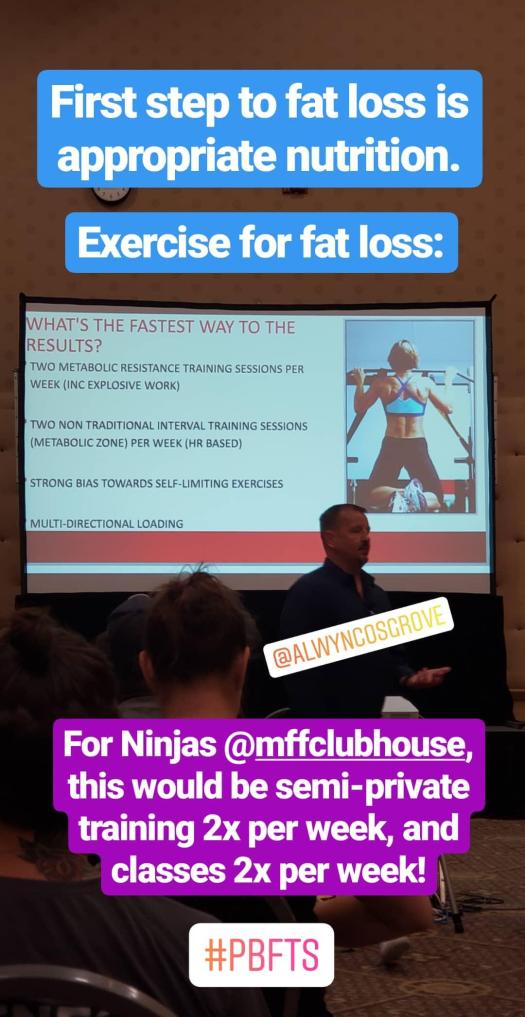 After Brian’s talk, I went to see the Godfather of modern fat loss training, Alwyn Cosgrove. Alwyn may have had a bigger impact on how we do things at MFF than anyway else, and I’m always excited to learn from him.