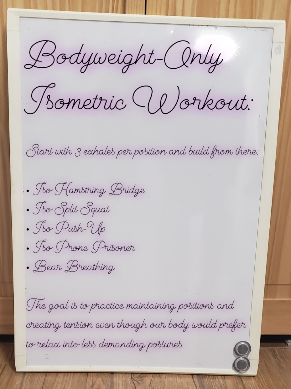 Let’s say that a high-quality exhale is 8-12 seconds long, so start with 30 second / 3 exhale holds, and build out from there. I practiced this workout with my wife and she gave me the feedback that, “You exhale really slowly!” I sure do, because I’m trying to create the highest-quality tension possible. As you do more sets of this, our natural tendency will be to exhale faster to get it over with faster – acknowledge the inclination to breathe faster, and then make sure you’re keeping the slowest, fullest exhale possible!